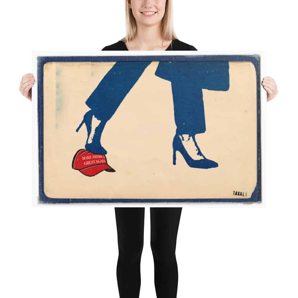 “Kamala 2024” by Gary Taxali, available as a protest art poster. This piece brings the artist’s acclaimed pop art into a collectible format, designed in his Toronto studio. “Kamala 2024” channels campaign-trail energy through Taxali’s retro-graphic lens on this poster.